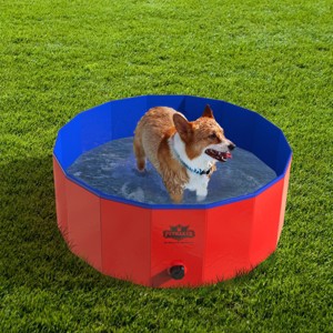 - PRODUCT DETAILS - Materials: PVC. Dimensions: (L) 30.5" x (W) 30.5" x (H) 12". Folding Pool Recommended for Pets up to 40lbs. Includes: Small Pool and Carry Bag with Handles. Color: Red and Blue.
