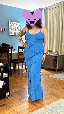 [This review was collected as part of a promotion.] Such a beautiful feminine dress for a wedding I was attending! I’m 5’6” and it hits right at my ankles. Ruffles are super flattering and hide the stomach area so I didnt even need to wear spanks to smooth things out. Note: the ruffles have a raw seam on them so was fine cause my event was semi formal but I wouldn’t recommend for a formal/black tie event