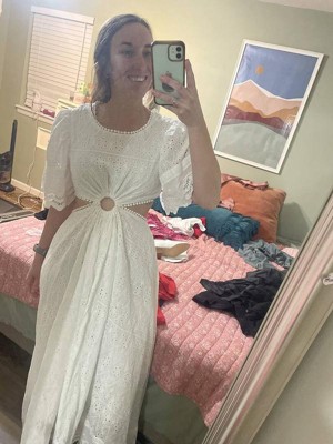 Crafted from a beautiful broderie anglaise fabrication, this maxi length dress is the perfect balance of style. It features a round neckline with trim detail and back button close, short sleeves and an eye-catching front cutout feature while the a line skirt creates movement.