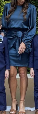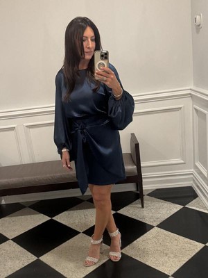 This is the perfect party dress for any occasion! The above knee length and high round neckline look oh-so-chic, while the long sleeves with elasticised cuff keep you comfortable. The satin sheen finish gives this dress that luxurious feel, so you'll be sure to sparkle and shine at your next party event!