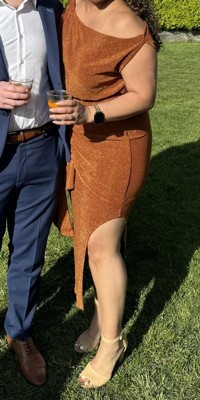 This gorgeous off shoulder dress features a sleek bronze glitter material with an asymmetric neckline, sleeveless design and attached waist tie, you'll be able to flaunt your figure and look sharp. The side split detail adds a trendy touch. Crafted from mid-stretch fabric, this is a must have dress!