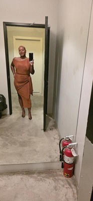 This dress is incredible!! Super flattering, really comfortable, and the color is perfection! So excited to wear this to a fall wedding in a few weeks! The fabric has great stretch without feeling cheap, and the side slit adds even more fun to the dress. I love that the wrap tie is fully adjustable to allow me to tie it in a way that looks good on my body. I am tempted to buy this in more colors!!