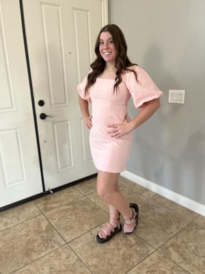 If you're looking for something mini, feminine and fun that still looks elegant, then this mini dress is the perfect choice. With an above knee length cut, a square neckline and puff sleeves with elasticized cuffs and shoulders, it's sure to be a party favorite.