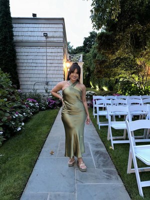 I am obsessed with the color and subtle sheen of the fabric! It is so flattering, especially around the stomach area, unlike other form-fitted silky dresses. Perfect for a semi-casual wedding.