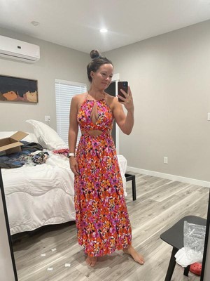 Take your night-time look to the next level with this stunning maxi dress! Featuring a halter neckline that ties close and front cut out under bust, you will be sure to make an entrance. The stretch material gives you a comfortable fit that is perfect for any occasion. If you are in between sizes, we do suggest selecting the size down due to the to stretch in this fabrication.