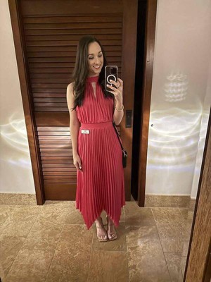 [This review was collected as part of a promotion.] This is a really vibrant dress. It hangs nicely. It is thin, planning to wear with a slip. Nice fit, bright color. I love it. Matched with a lulu purse and jacket, and Michael Kors. I’m excited to wear it. It’s comfortable too and hides any lower body lumps well!! Bonus for my cellulite 😂