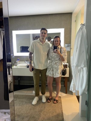 [This review was collected as part of a promotion.] I’ve been looking at this romper for a while and finally ordered. The pattern is unique and cute but the oversized look just didn’t work for me. I tried it on with heels and with the tie around my waist and it still didn’t work. It is also very see-through, and there are no belt loops for the belt, which makes it odd to place.