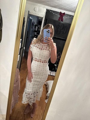 Calling all party-goers! Perfect for special occasions and events, this midi length dress is sure to turn heads. Its timeless design featuring a lace overlay and high round neckline will make you stand out from the crowd.