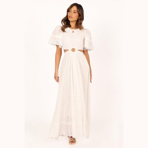 Crafted from a beautiful broderie anglaise fabrication, this maxi length dress is the perfect balance of style. It features a round neckline with trim detail and back button close, short sleeves and an eye-catching front cutout feature while the a line skirt creates movement.