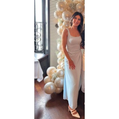 This dress is praised for its beautiful color and flattering style, making it a great choice for various occasions, including weddings and engagement photos. Many guests appreciate its elegance and fit, although some note that it runs small, particularly in the bust area. The material is generally considered pretty, but a few guests mention it being thinner than expected. Overall, it offers a stylish option for those who can find the right size.