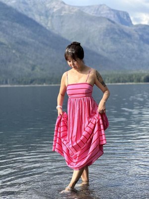 Absolutely adore this bright pink dress. Perfect sundress for summertime. As some of the other reviews say, the skirt is unlined which is a little bit of a bummer, but a slip or shorts underneath will suffice just fine. TTS. I was worried about the length and fit and that was not a problem at all. Hits me around the ankles and the bust area feels secure, not too loose or tight! Fabric is comfy as well.