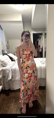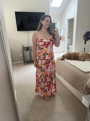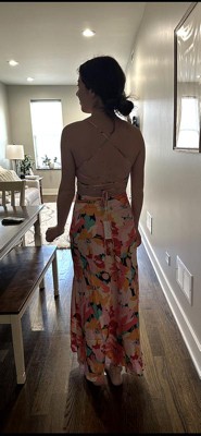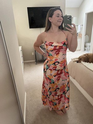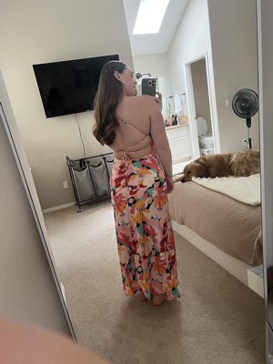 [This review was collected as part of a promotion.] I fell in love with the bright colors of this dress online and it lives up to the hype in person. It lays perfectly and the back is all open so you can tie it to your desired fit. I got a size small which is my normal size. Looking forward to wearing this to a wedding this summer!