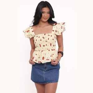 Add a pop of color to your wardrobe with the Remira Smocked Ruffle Top in Yellow Cherry. This cropped beauty features a playful fruit print that's perfect for warm, sunny days.