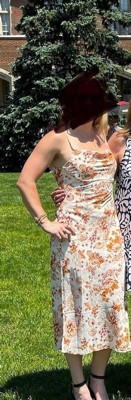 [This review was collected as part of a promotion.] I ordered this dress in hopes of using it for a summer wedding. The dress was very cute and a silky material but the shape was not right for my body type. I have a larger chest and the top sat more straight across my bust (vs the dip seen in the model photo). Maybe going up a size would’ve helped. Return process was easy!