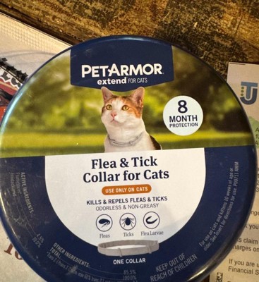 [This review was collected as part of a promotion.] My cat although looks like a kitten she is a full grown 10 yr old cat. Her growth was way under. We found her as a baby kitty yrs ago behind a dumpster with no momma so we adopted her. She stays outside and in both so we do get fleas and ticks. This collar is non greasy like most, no particular smell at all and has been working great. Easy to use, just open, measure on cats neck then you can adjust it to fit by cutting any excess off. Mollie doesn’t seem to mind it at all so must be comfortable for her. We haven’t had a problem with either fleas or ticks. if I find one it’s dead. This collar last up to 8 months it says which is really good for a collar