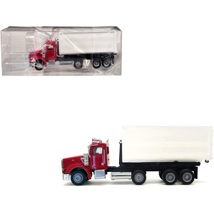 Brand new 1/87 (HO) scale plastic car model of Peterbilt 367 Roll-Off Dump Truck Red with White Box plastic model car by Promotex.
