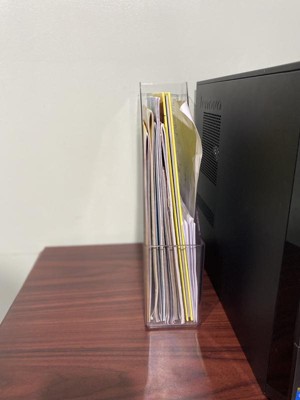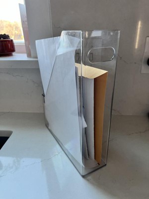 perfectly simple, sturdy clean and highly functional file holder. I love the clear hard plastic form. I have used this primarily for my home desk when i work from home and it is perfect! makes my home work desk less cluttered looking. Great plus that it has a 'hole/handle' on top so you can easily move it around . Will definitely get more for my magazines !