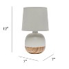 What better way to combine classic favorites with today's trendy decor? Textures, prints, and more! A rounded ceramic base is enhanced by a strip of wooden print across the lower portion of the base. With a fabric shade finalizing the look, we're sure this 12" piece will not only illuminate your space, but definitely integrate some modern vibes in your room of choice as well.