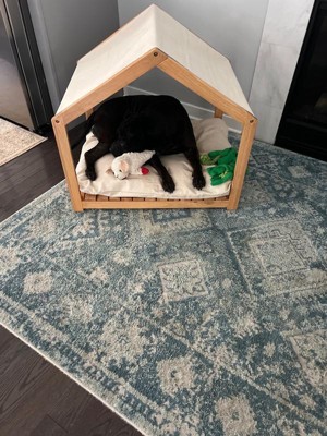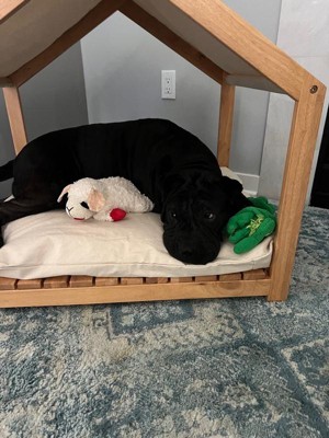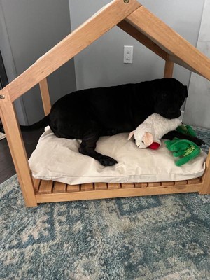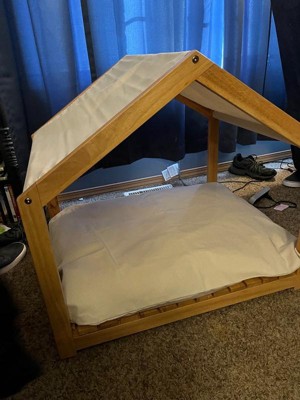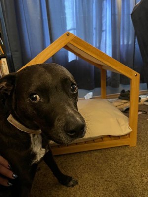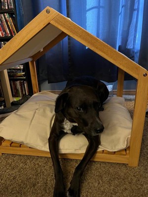[This review was collected as part of a promotion.] This dog house by PetMaker was easy to install and is durable but lightweight enough to move around your house. It has a cute contemporary canopy, base, and sides. It comes with a cushion but you can also use your own. Fits perfect for most dogs 50 lbs or so. Mine is 60 and still fits well. All real wood and gives your dog a quiet and secured place to relax. My Hippy took to it very quickly.