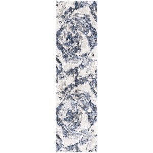 This runner rug beautifully showcases a dynamic abstract pattern, featuring swirls and strokes in a captivating Ivory and Blue color palette. The design, though pictured in a different size, is consistent in its mesmerizing appeal, promising to become the focal point of your hallway or living area.