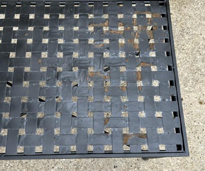 The finish starting coming off and fading within a week of this table being on our porch. It was never treated, cleaned or even used. We put it together and took it outside, went on vacation for a week and came back to find the table now had a rough, yucky finish on it. After about three weeks I started to notice rust spots starting. We also have two matching end tables for the set and they are doing the same thing. Really disappointed in the quality for the price. I would not recommend purchasing this item. You won't even get one season of use out of it. I can't even imagine if these sat out all winter what they would look like next year. I plan to bring them inside to storage for the winter. At some point I'll have to invest in powder coating for them. They're pretty but they're junk. I tried to add photos but they would not upload.