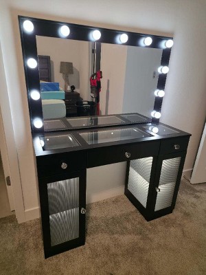 - Hollywood-Style Lighting Mirror - Large vanity desk (43.3"L x 15.7"W x 56.6"H) get flawless lighting every time with the oversize mirror surrounded by 12 soft-glow bulbs. Ideal for makeup, skincare, and hair styling - day or night.