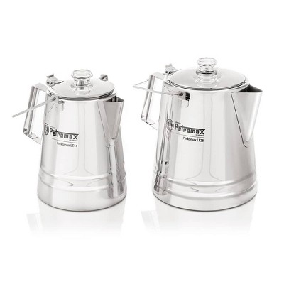 The Petromax Perkomax is ideal to prepare an aromatic tea or coffee without much effort. The unique percolator principle gives coffee and tea a delicious flavor.Great performance on all sources of heatThe Perkomax is suitable for outdoor and indoor use: It can be used on a barbecue and over a campfire, as well as on a cooking plate, a ceramic glass cooktop and an induction cooker. The Perkomax can prepare 5-6 cups of tea or coffee at a time. The preparation time varies depending on the temperature of the heat source and the quantity of water.A unique taste thanks to the percolator principleWhen heated up, the water rises to the top through a small tube thanks to the ingenious percolator principle. A round filter for coffee powder is placed on the top of the tube. The hot water is pushed upwards, over the coffee powder and flows back down to the pot, as if through a sieve. It then mixes with the water and rises again. The longer the water circulates, the stronger the tea or coffee becomes. This unique principle releases the finest tea and coffee flavors. You can thus prepare an aromatic, full-bodied coffee at home or during a camping trip or any other outdoor activity without a lot of accessories.Material: steel, enameled. Color: Black or White. Max. filling capacity: 1.3 liters (5-6 cups). Packaging size: 6.3" L x 6.3" W x 8.6" H, 1.9 lbs..