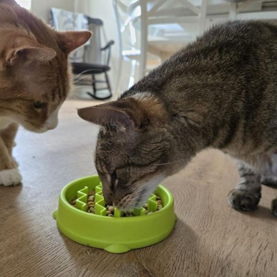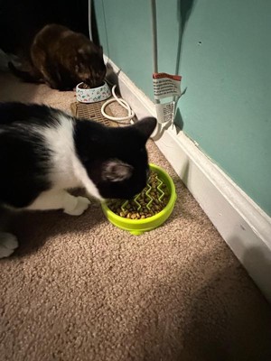 [This review was collected as part of a promotion.] This slow cat feeder bowl works amazing when you have a cat that doesn't know how to slow down to eat. My cat has been having issues eating too fast, and now, with this, he actually has to take his time to get the food out. It's also pretty easy to clean.