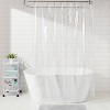 Add some elegance to your bath space with this PEVA Holographic Shower Curtain from Room Essentials™. Crafted from 100% PEVA material, this decorative shower curtain features a grommet top that helps create a well-defined, pleated look. Featuring a clear design with a holographic finish that produces a 3D light effect, it brings simple style to your bathroom decor. Coordinate it with the bath accessories of your choice to give your bathroom a stunning makeover.