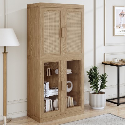 The storage cabinet in question is a versatile piece of furniture designed to meet various organizational needs within a home. It can function as a pantry cabinet, providing ample space for kitchen essentials and groceries, ensuring they are neatly stored and easily accessible when needed. Additionally, it serves as a sideboard cabinet, offering extra surface area for decorative items or serving dishes, enhancing the aesthetic appeal of dining spaces. Furthermore, its adaptability extends to acting as an entryway cabinet, where keys, mail, and personal belongings can be conveniently stowed away, maintaining order and tidiness at the entrance of a home.