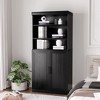 The storage cabinet in question is a versatile piece of furniture designed to meet various organizational needs within a home. It can function as a pantry cabinet, providing ample space for kitchen essentials and groceries, ensuring they are neatly stored and easily accessible when needed. Additionally, it serves as a sideboard cabinet, offering extra surface area for decorative items or serving dishes, enhancing the aesthetic appeal of dining spaces. Furthermore, its adaptability extends to acting as an entryway cabinet, where keys, mail, and personal belongings can be conveniently stowed away, maintaining order and tidiness at the entrance of a home.