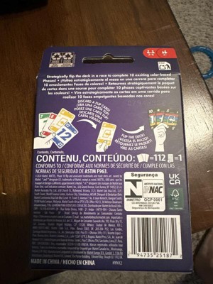 From the makers of UNO card game, Phase 10 Flip turns the classic Phase 10 card game on its head! Players still race to complete 10 Phases, but with some unexpected twists—like a double-sided deck and special FLIP cards! One side of the deck features cards with standard colors, but the other side is ALL WILD! Because the Phases in this game require runs of the same color, players must strategically flip the deck to the Wild Side to help complete their Phases more quickly, or flip back to the Color Side to hinder their opponents. This fun family card game is perfect for 7 year olds and up. Colors and decorations may vary.