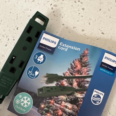 Power up your holidays with extended reach of the Philips 3-Outlet Grounded Extension Cord. Dressed in green to blend in with your seasonal décor, this heavy-duty extension cord is rated for outdoor use and features three grounded AC outlets and a 3-prong grounded plug to provide safe, dependable power for all your seasonal decorations and more.