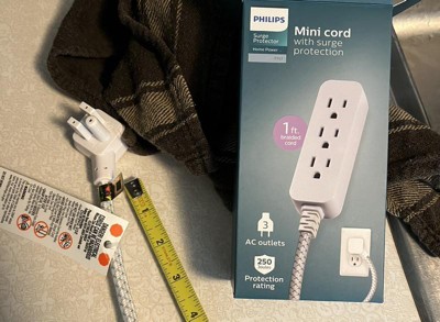 Philips 3-Outlet Surge Protector with 1 Ft. Extension Cord, Gray and White: Short Cord