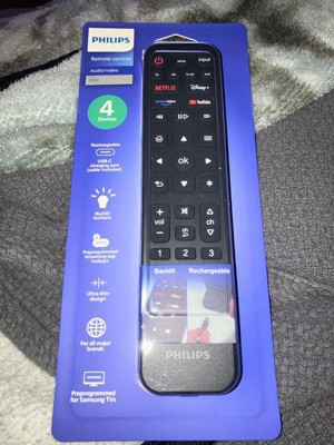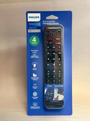 Relax, recharge and take control of your entertainment with the innovative Philips Elite Rechargeable Universal Remote. This slim, 4-device remote features an integrated rechargeable battery that stays powered for months on a single charge — no more replacing worn-out batteries. Simply connect the remote control to a power source using the included 18in. USB-C to USB-A cable. The charging indicator light glows blue during charging and green when fully charged. Additionally, the remote is safe to use while charging. Designed to control up to four devices, including your TV, Blu-ray/DVD player, streaming media player, soundbar and more, this universal remote control features app hotkeys programmed for direct access to popular streaming apps: Netflix, Disney+, Prime Video and YouTube. The TV and STR (streaming) device buttons come preprogrammed for Samsung TVs and Roku streaming boxes, and all device buttons can easily be programmed for use with thousands of other devices using automatic code search or direct code entry programming. For added convenience, this remote offers full backlighting as well as simple menu navigation and a dot button for direct sub-channel access. The Philips Elite Rechargeable Universal Remote is your ticket to great entertainment.