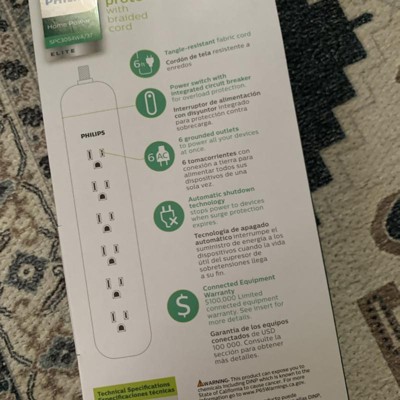 The surge protector’s extra-long 6ft. braided fabric power cord is connected to a flat plug, allowing it to plug in easily behind desks, sofas and other furniture. Featuring a white and gray pattern, the decorative, woven fabric increases the cable’s durability, is tangle-resistant and adds instant style to any space. For use in grounded (three-prong) outlets only, this product comes equipped with a $100,000 connected equipment guarantee and is backed by a limited-lifetime no-hassle replacement plan. Your outlet deserves an upgrade with the Philips 6-Outlet Surge Protector. Model #SPC3054WA/37