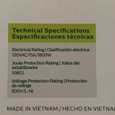 submitted byTech Support - 1 year agoBrand expertA: Hi , thanks for reaching out about the Philips 6-Outlet Surge Protector with 6ft Extension Cord, White The Philips 6-Outlet Surge Protector surge protection rating of 1,080 Joules & 5000 Volts and ETL Listed, not UL. If you have any additional questions, we welcome you to contact MyTGTtech at 833-848-8324 every day, between 7am-11pm CST.
