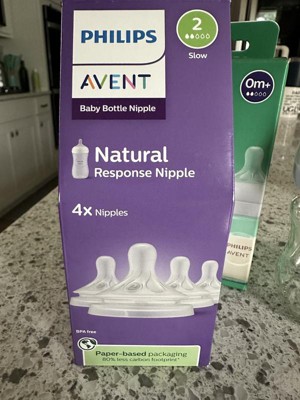 Philips Avent Natural Response nipple lets baby control the pace of the milk, like they do when breastfeeding. The nipples' unique opening and tip only releases milk when your baby actively drinks. When pausing to swallow and breathe no milk flows. Baby can drink, swallow, and breathe using their natural rhythm, just like they do when breastfeeding. Easily combine breast and bottle feeding with a wide breast-shaped nipple with a soft feel that mimics the shape and feel of a breast; plus baby controlling the flow of milk. The nipple has a no-drip design which helps prevent lost milk from the tip. An anti-colic valve integrated into the nipple is designed to reduce colic and discomfort by sending air away from your baby's tummy. The Natural response nipples come in flow rates 1-5, to keep up with your baby's growth. Use Philips Avent Natural bottles only with Philips Avent Natural nipples. Includes: 2 Natural Response nipples, flow 2. SCY962/02