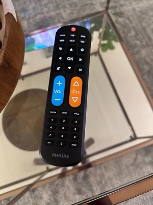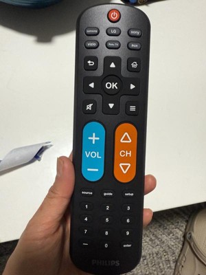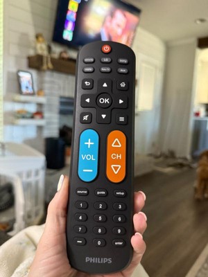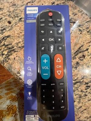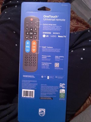 Effortless setup, ultimate control — the innovative, patent-pending Philips OneTouch Universal Remote is your ticket to hassle-free entertainment. This extra-large black remote features large, easy-to-see backlit buttons, colorblind-friendly volume and channel buttons, as well as OneTouch programming for five popular TV brands: Samsung, LG, Sony, Vizio and Roku TVs, making it a great choice for seniors, the visually impaired and anyone wanting a simple, easy-to-use remote. Patent-pending OneTouch technology provides the easiest TV remote setup ever. Simply insert two AA batteries, then press the TV device button that matches your TV’s brand. With just one touch, your remote is programmed to operate your TV. The universal remote control’s AUX button comes programmed for use with Roku boxes but can easily be reset to operate one of thousands of compatible audio/video devices, such as a Blu-ray/DVD player, cable or satellite receiver, gaming console, etc., using direct code entry or auto code search programming. And, the fully backlit keypad is perfect for navigating to your favorite channels and shows in low-light settings. Take full control of all your TVs with the easiest replacement remote ever — the Philips OneTouch Replacement Remote.