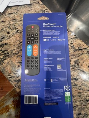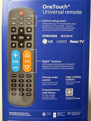 - Innovative OneTouch setup – Program your Samsung, LG, Sony, Vizio or Roku TV with one button press after inserting two AA batteries, no complicated steps required; AUX button is programmed for Roku boxes but can easily be reset for a different device