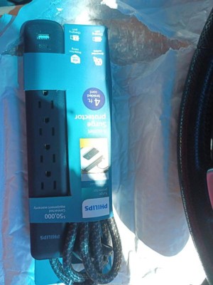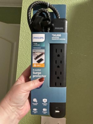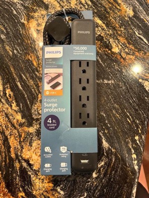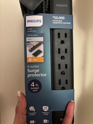 Philips Surge Protector 4ft 4-Outlet USB-A USB-C 450 Joules Braided Cord Flat Plug - Black