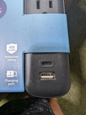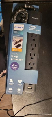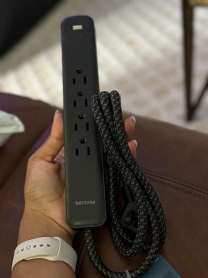 Your power does more with the Philips 4-Outlet, 1-USB-C, 1-USB-A Surge Protector. Featuring four grounded AC outlets as well as a USB-C port and USB-A port with 15W of combined charging power, this powerful extension cord adds outlets where needed most and safeguards your electronics from dangerous power surges. The surge protector has an integrated circuit breaker to protect your electronics if the capacity is exceeded by a power surge and automatic shutdown technology to cut power if the components expire. A surge protection rating of 450 Joules ensures your electronics are shielded from voltage spikes. The convenient 4ft. braided fabric power cord offers a flat plug, allowing it to plug in easily behind desks, sofas and other furniture. Featuring a sleek black finish, the decorative, woven fabric increases the cable’s durability, is tangle-resistant and adds instant style to any space. For use in grounded, three-prong outlets, the outlet extender provides a $50,000 connected equipment policy and is backed by a limited-lifetime no-hassle replacement plan. Your outlet deserves an upgrade with the Philips 4-Outlet, 1-USB-C, 1-USB-A Surge Protector.