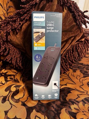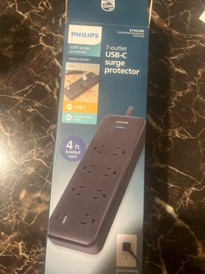 Maximize your power with the Philips 7-Outlet Surge Protector with USB Charging. This essential surge protector converts one grounded outlet to seven that are perfectly spaced to accommodate bulky adapters. There are two USB ports — USB-A and USB-C with 15W shared to charge your phones, tablets and more! It is equipped with an integrated circuit breaker that protects your electronics if the capacity is exceeded by a power surge. Featuring a surge rating of 1,500 Joules and a protected indicator light, rest assured your electronics are safeguarded from voltage spikes. Easily power and protect your devices from a distance with the braided 4 ft. cord. The stylish woven fabric of the cord prevents bends or tangles, extending the lifetime and durability of your cord. For use in grounded outlets only, this high-quality surge protector is cETL listed and backed by a limited-lifetime, no-hassle replacement plan as well as a $150,000 CEW policy for added peace of mind. Protect your essential devices confidently with the Philips 7-Outlet Surge Protector with USB Charging.