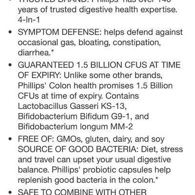 - FREE OF: GMOs, gluten, dairy, and soy SOURCE OF GOOD BACTERIA: Diet, stress and travel can upset your usual digestive balance. Phillips' probiotic capsules help replenish good bacteria in the colon.*