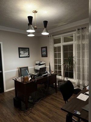 [This review was collected as part of a promotion.] The Phix 6 light chandelier was a perfect addition to the den it was installed in. The Champagne Bronze finish was a great compliment to the wall color and wood tones featured in the room. The up and down lighting spreads the light evenly through the room without creating any “hotspots” of light. We put the light on a dimmer to adjust the light from a low ambient lighting to higher level when working in the den. The quality of the light is superb.