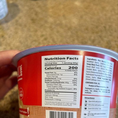 rice noodles [rice flour, modified starch, stabilizer: guar gum]. soup base pack [salt, sugar, beef tallow, dried beef stock, chicken tallow, dried chicken broth, spices, yeast extract, fish sauce (fermented anchovies, maltodextrin), disodium inosinate & guanylate, hydrolyzed vegetable protein, torula yeast, onion, garlic]. non-gmo air dried vegetable pack [dried cabbage, carrots, broccoli florets, onion].