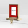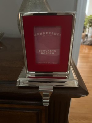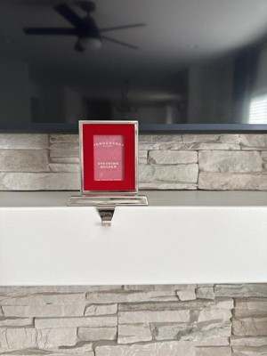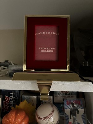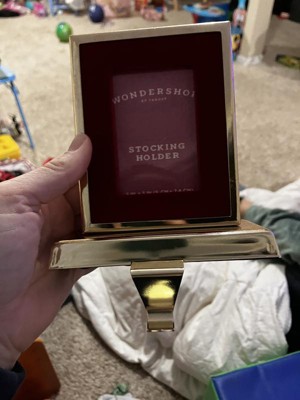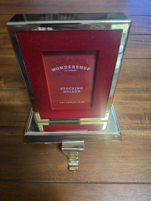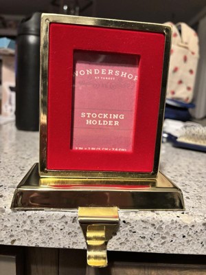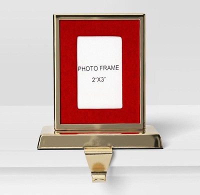 Add a personal touch to your holiday decor with this Photo Frame Stocking Holder from Wondershop™. This photo frame features a gold-tone frame crafted from metal and a red backdrop, perfect for highlighting your treasured photos. Plus, it comes with a flat base for easy placement and includes a hook for hanging and displaying Christmas stockings.