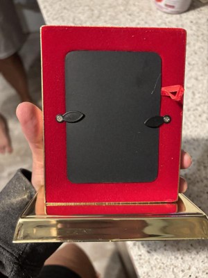 A: The photo frame features a gold-tone frame with a red backdrop.