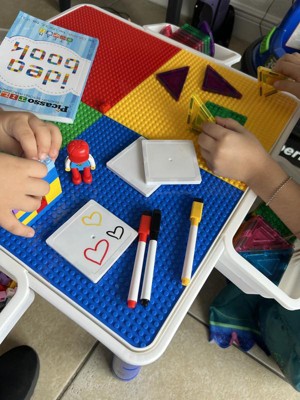 PicassoTiles 585pc Kids Activity Table with Magnetic Tiles and Bricks STEM Pretend Play Learning with Reversible Brick Whiteboard Tabletop Storage Bins and Extra Add-On Toys Boys Girls Ages 3+ PBT585