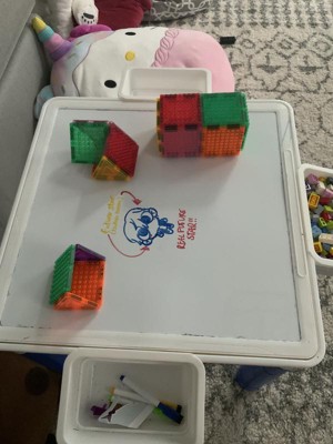 [This review was collected as part of a promotion.] Having a little table where you can build and store PicassoTiles and building bricks is a little kid’s (and parent’s) dream come true. This product checks those boxes. It is easy to assemble and the quality has so far been great. I love that it occupies my 4 year old and also my 7 year old. It encourages them to use their imagination, be creative and strengthen their fine motor skills. No cons for this product.